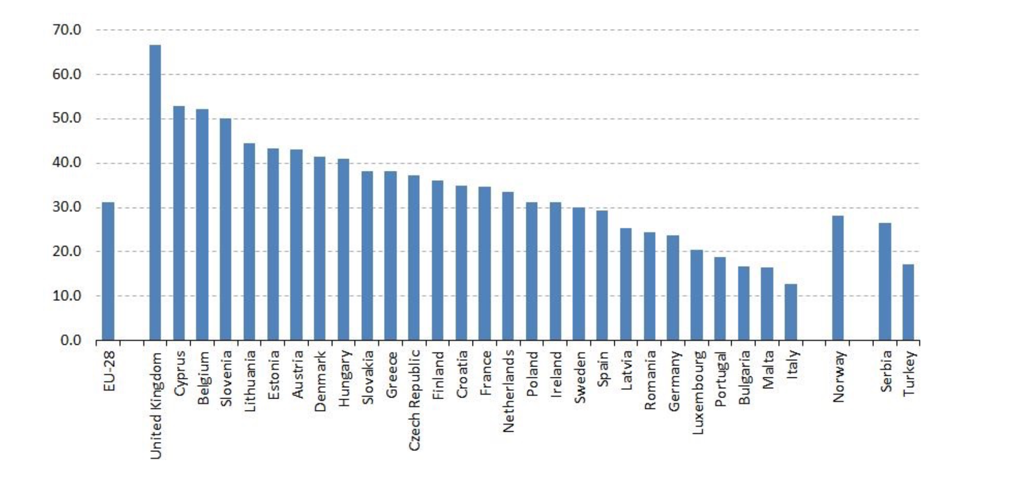 Legenda Gráfico 1 - Empresas que investem em inovação envolvidas em programas colaborativos, por país, 2012 (% de empresas que investem em produtos ou processos inovadores), in Eurostat