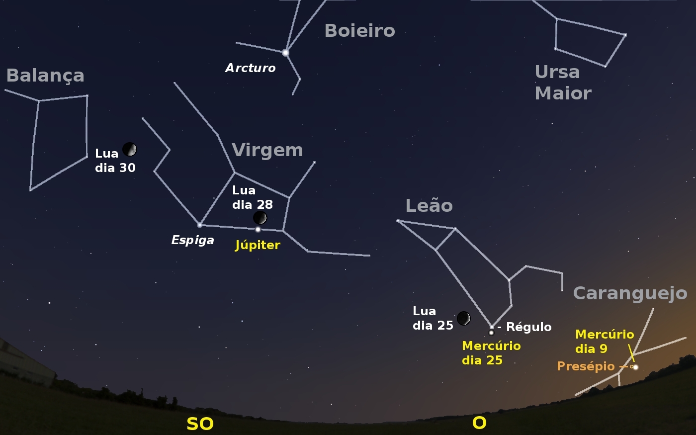 A Lua Nova terá lugar no dia 23, não sendo possível observar o nosso satélite natural por se encontrar na direção do Sol. Mas ao início da noite de dia 25 já iremos encontrá-la junto a Mercúrio e Régulo, o coração da constelação do Leão.
