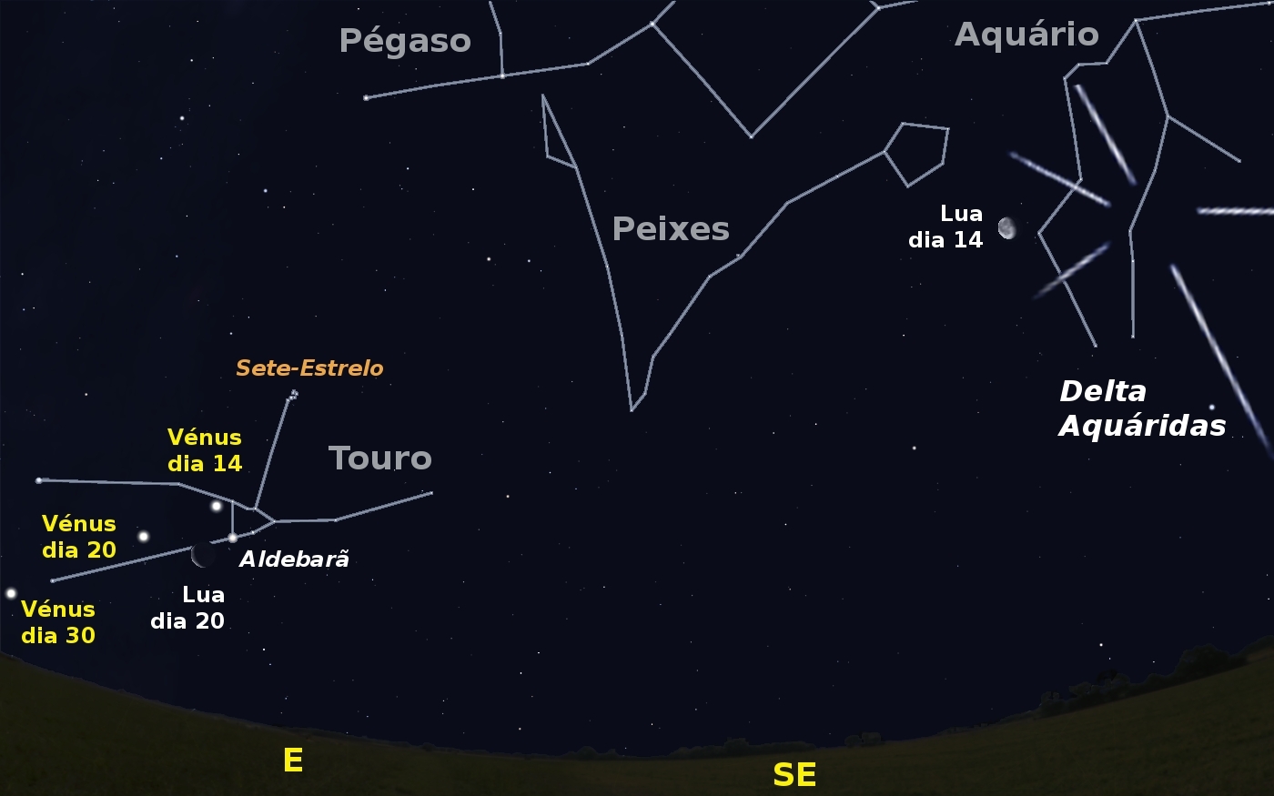 Figura 2: Céu a sudeste pelas cinco horas da madrugada de dia 30. Também é visível a posição da Lua e Vénus nas madrugadas de dias 14 e 20 e o radiante da chuva de estrelas delta Aquarídas.