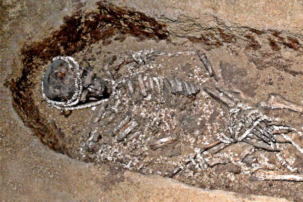 Detalhe de um dos locais onde se encontravam enterrados restos mortais em Sunghir, na Rússia. Neste estudo, os investigadores sequenciaram os genomas de quatro indivíduos enterrados no local e descobriram que eles eram, no máximo, primos em segundo grau, indicando que eles estabeleceram relações sexuais para além do seu grupo social e familiar mais próximo.