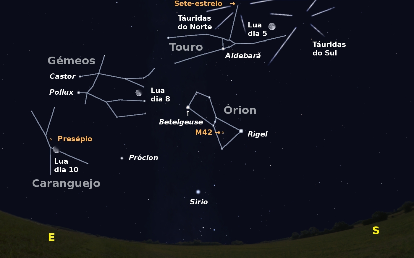 Figura 1: Céu a sudeste pela uma hora da madrugada de dia 5, com algumas estrelas e constelações de destaque (p.ex. a nebulosa de Órion - M42). Igualmente são visíveis a posição da Lua ao início das madrugadas de dia 8 e 10 e os radiantes das chuvas de meteoros das Táuridas do Sul e do Norte.