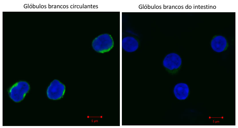 Legenda da imagem anexa: Nos glóbulos brancos circulantes (à esquerda) as “baterias” ou mitocôndrias (a verde) têm um sinal mais intenso - quando comparadas com as mitocôndrias dos glóbulos brancos do intestino que são “baterias mais fracas” (à direita). A azul estão marcados os núcleos das células. Créditos: Špela Konjar, iMM.