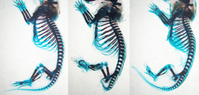 Legenda da Imagem anexa: Os esqueletos de ratinhos normais têm uma cauda com 31 vértebras (esquerda), a cauda de ratinhos em que se aumentou a atividade do gene Hoxb13 tem poucas vértebras (centro), enquanto que a cauda de ratinhos em que se aumentou a atividade do gene Lin28a tem 36 vértebras (direita).