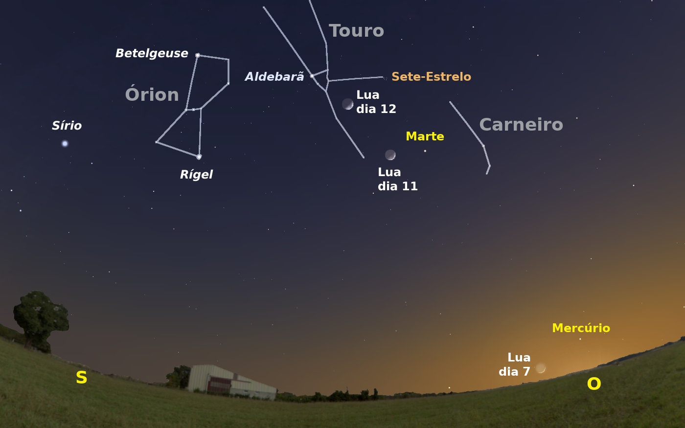 Na noite de dia 11 a Lua situar-se-á à esquerda de Marte. Na noite seguinte a Lua terá chegado à constelação do Touro, com o aglomerado estelar do Sete-Estrelo (ou Plêiades) à sua direita. Este é um conjunto de estelas formadas juntas quais "sete irmãs" (outro dos seus nomes). Dois dias depois (dia 14) ocorre o quarto crescente.