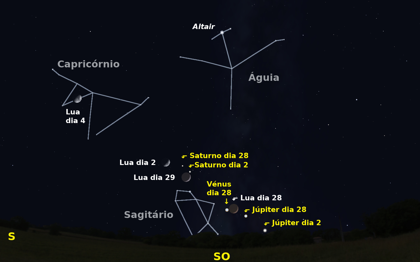 Figura 1: céu a sudoeste ao início da noite de dia 2. Igualmente é possível ver a posição de Vénus, Júpiter, Saturno e da Lua no dia 28, e desta última nas noites de dia 4 e 29.
