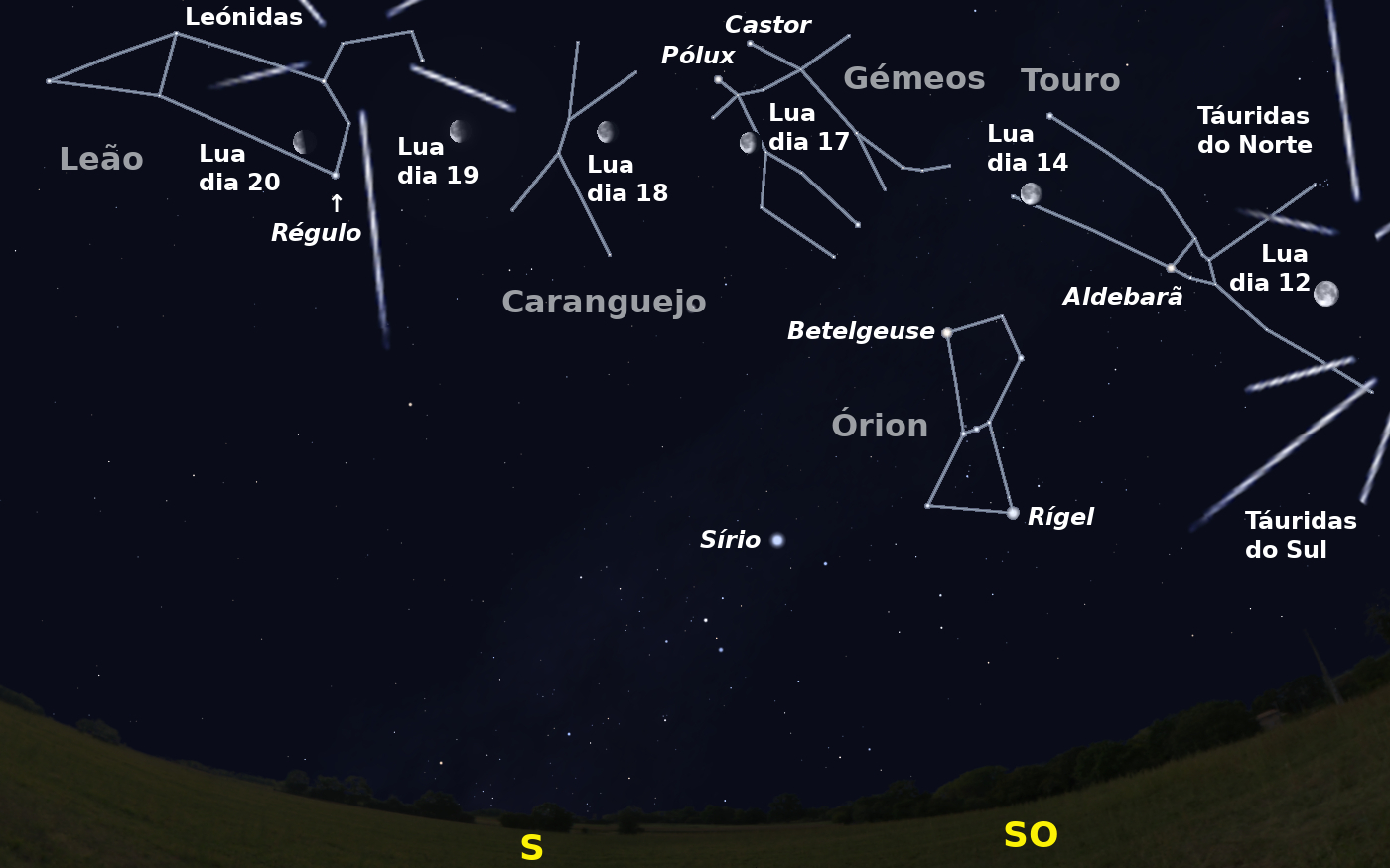 Figura 2: céu a Sul pelas cinco horas da madrugada de dia 29. Igualmente é visível a posição da Lua nalgumas das madrugadas de dias 12 a 20, e os radiantes das chuvas de estrelas Leónidas, e Táuridas do Sul e do Norte.