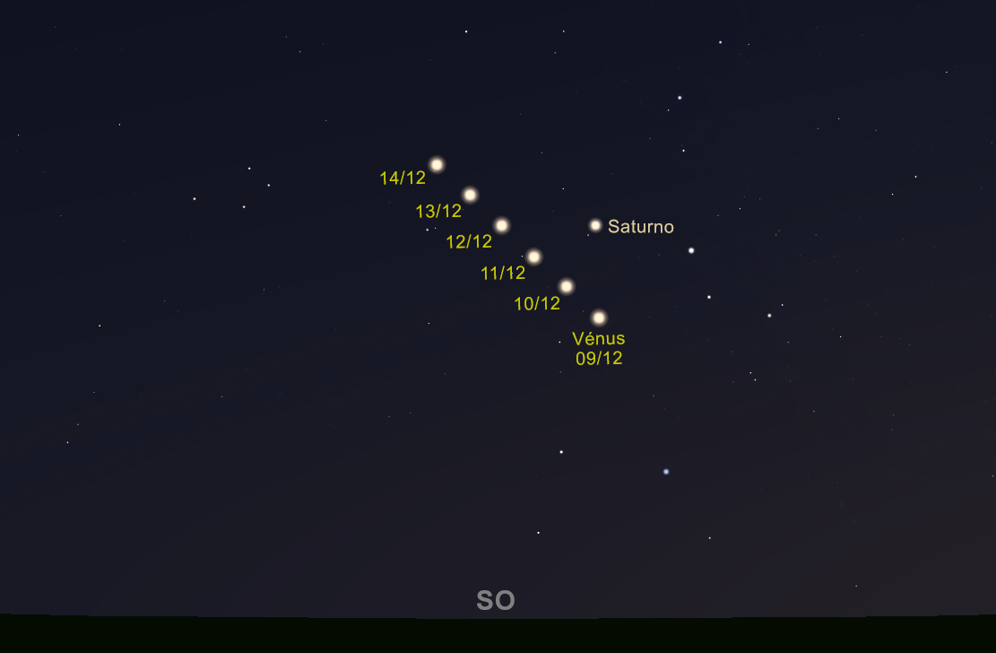 Figura 2: O céu virado a Sudoeste, com as posições dos planetas Vénus e Saturno, entre os dias 9 e 14 de dezembro 2019. (Imagem: Ricardo Cardoso Reis/Stellarium)