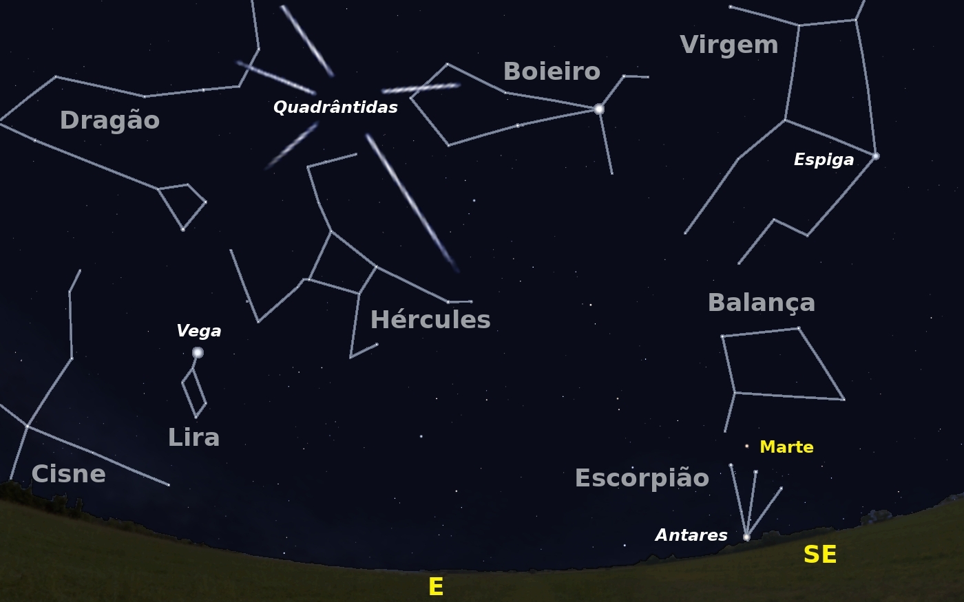 Pelo final da madrugada seguinte tem lugar o pico de atividade da chuva de estrelas Quadrântidas. Embora estas pequenas rochas e poeiras provenientes do asteroide 2003 EH1 possam surgir em qualquer parte do firmamento, todas parecerão irradiar de uma região situada entre as constelações de Hércules e do Dragão. Esta região celeste era ocupada pela constelação do Quadrante Mural, constelação que caiu em desuso há cerca de um século. Embora o pico de atividade desta chuva de meteoros possa atingir a centena de meteoros por hora, este ano deveremos contar no máximo com um quarto desse valor.