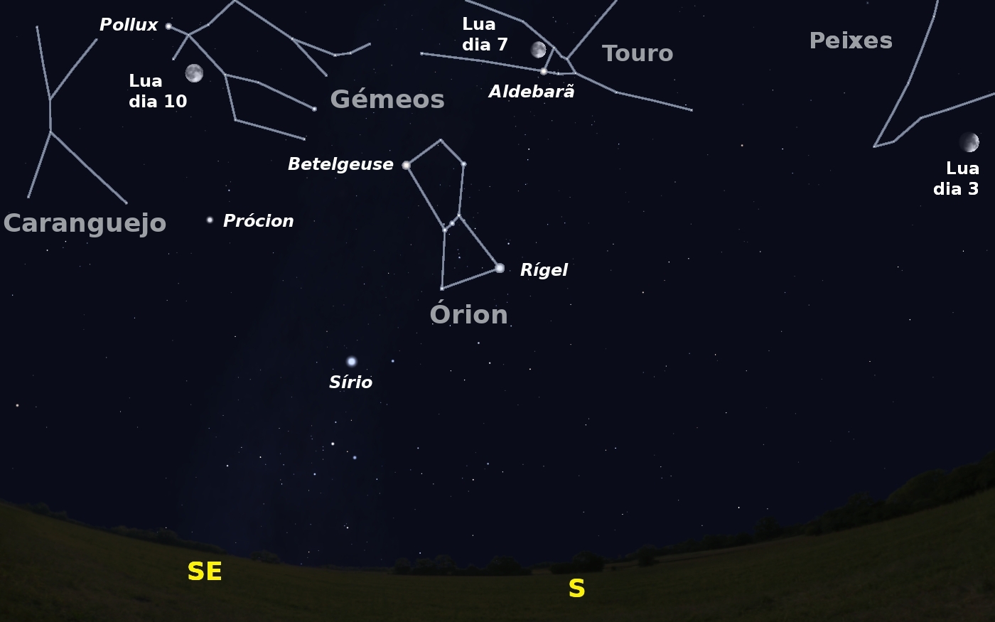 Figura 2: céu a sul pelas 22 horas de dia 10. Igualmente é visível a posição da Lua nas noites de dia 3 e 7. (imagens adaptadas de Stellarium)