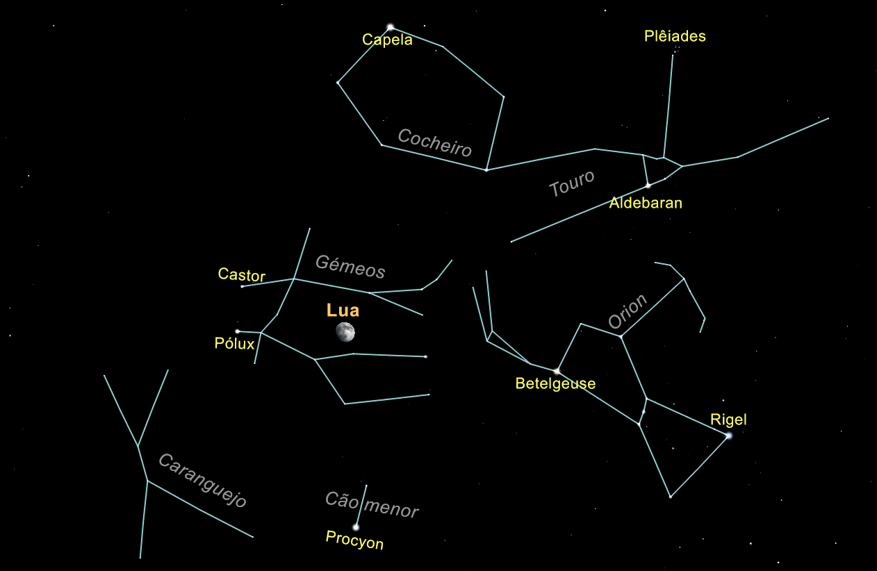 Figura 1: O céu às 20:00 do dia 6 de fevereiro 2020. A Lua quase cheia está no meio da constelação dos Gémeos, pouco acima da constelação de Orion (Imagem: Ricardo Cardoso Reis/Stellarium)