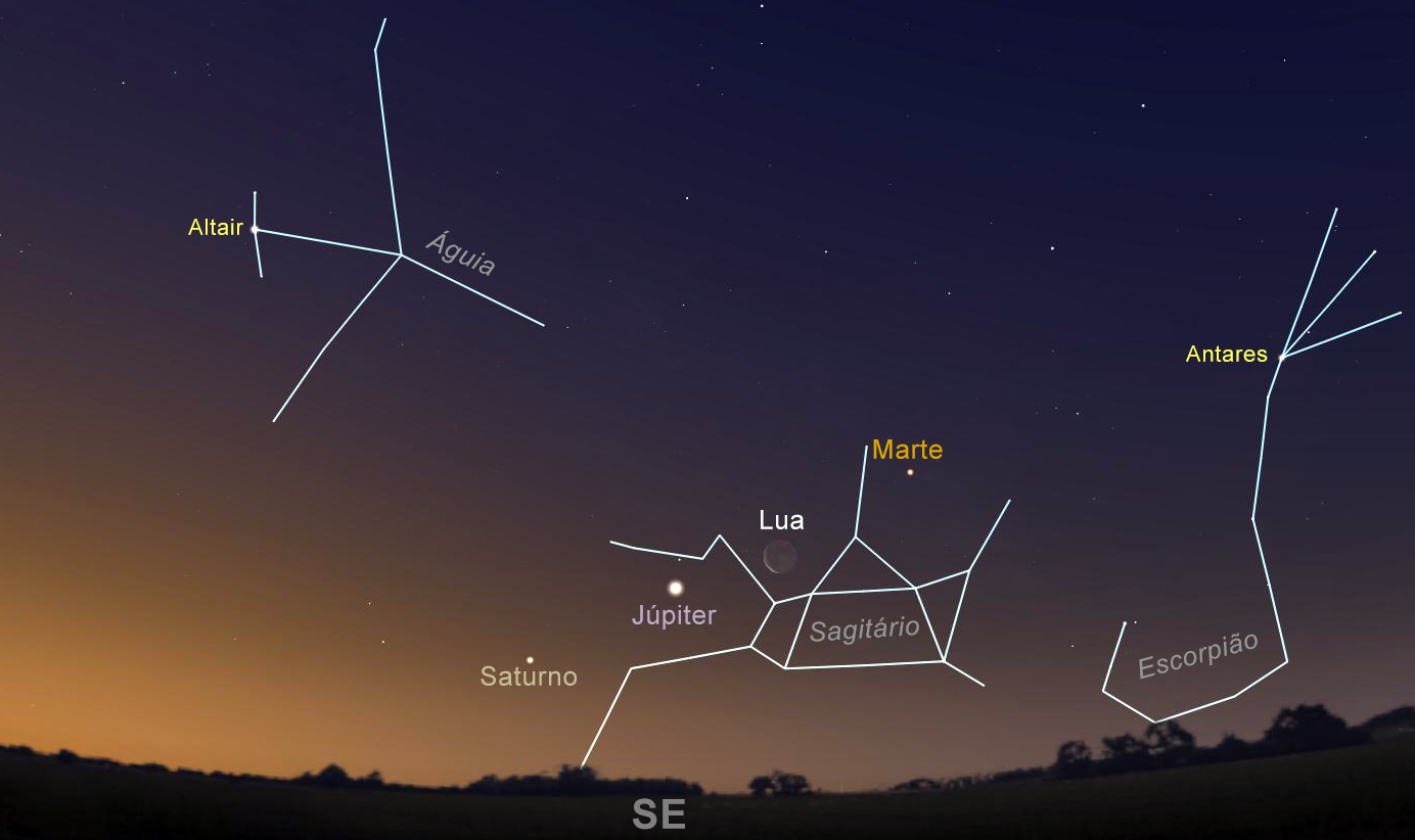 Figura 2: O céu ao amanhecer do dia 19 de fevereiro de 2020, virado a Sudoeste. Saturno, Júpiter, a Lua e Marte estão em alinhamento (aparente) no céu, na constelação de Sagitário. (Imagem: Ricardo Cardoso Reis/Stellarium)