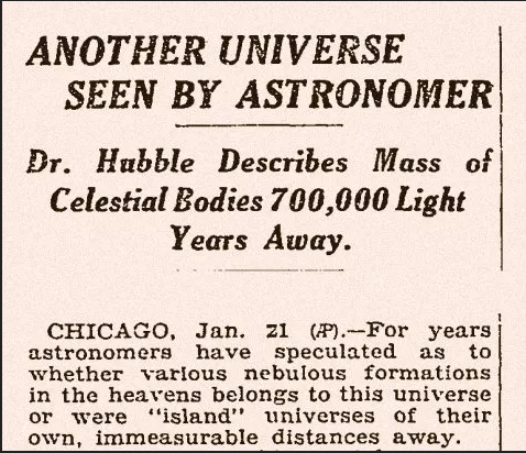 Foi Hubble que teve o mérito de solucionar este problema, mostrando que a visão de Curtis era a correta. Os jornais publicaram a notícia da descoberta de “um outro universo para além do nosso”, utilizando o termo “universo” para o que hoje chamamos “galáxia”.