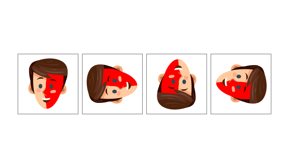 Imagem 1 - Ao serem apresentadas faces e objetos em diversas perspetivas, apenas as faces onde o lado direito estava visível apresentaram deformações.