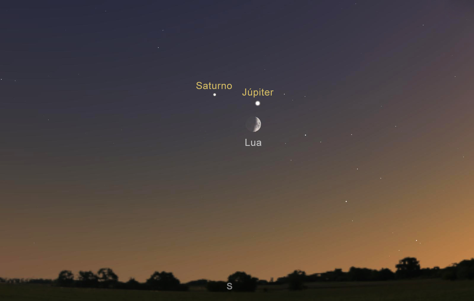 Já no dia 22 a Lua passa a menos de 3 graus de Júpiter e os dois fazem um triângulo com Saturno, a 5 graus da Lua. No dia 23, atinge a fase de quarto crescente.