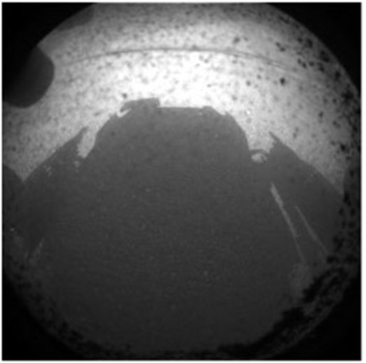 - Primeira imagem do Curiosity, a preto-e-branco e baixa resolução, vendo-se claramente a sombra do robô na superfície de Marte.