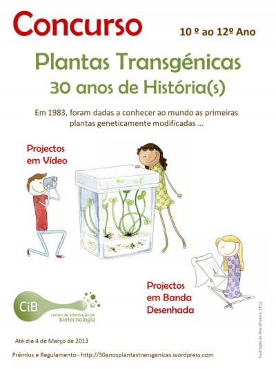 O CiB – Centro de Informação de Biotecnologia (http://cibpt.org/inicio/), mais uma vez organiza um concurso “Plantas Transgénicas: 30 anos de História(s)” para alunos do Ensino Secundário ou equivalente, durante o ano letivo 2012/2013.