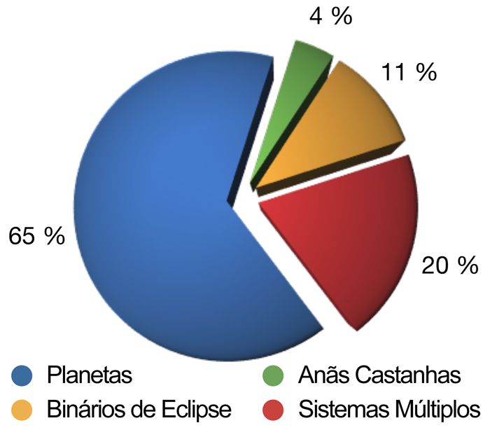 Estas observações permitiram à equipa detetar uma variedade de objetos, como “Júpiteres quentes”6, anãs castanhas7 e sistemas binários/triplos de estrelas. Para o Kepler é virtualmente impossível distinguir entre estes três casos, pois uma anã castanha, por exemplo, pode ter o mesmo tamanho que Júpiter (mas é cerca de 20 vezes mais massiva). Na amostra, 65% dos objetos eram de fato planetas, sendo 20% sistemas múltiplos, 11% binários de eclipse e 4% anãs castanhas.