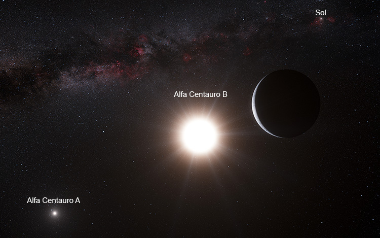 Alfa do Centauro é uma das estrelas mais brilhantes do céu, visível a olho nu no hemisfério Sul. A uma distância de apenas 4,3 anos-luz, é muitas vezes designada com a estrela mais próxima do nosso Sol. Mas o que aos nossos olhos parece ser apenas uma estrela, é na verdade um sistema triplo, composto por duas estrelas semelhantes ao Sol (Alfa do Centauro A e B) que rodam uma em torno da outra e, numa órbita exterior mais afastada, a estrela Próxima do Centauro, mais pequena e pouco brilhante, que roda em volta das outras duas.