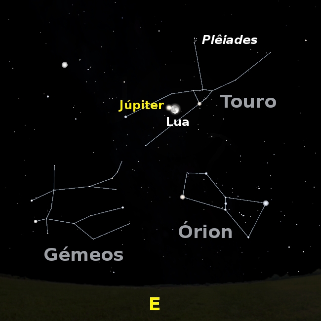 - Figura 1: Céu a Este pelas 23 horas de dia 1. A destacar a Lua, Júpiter e o enxame estelar das Plêiades.
