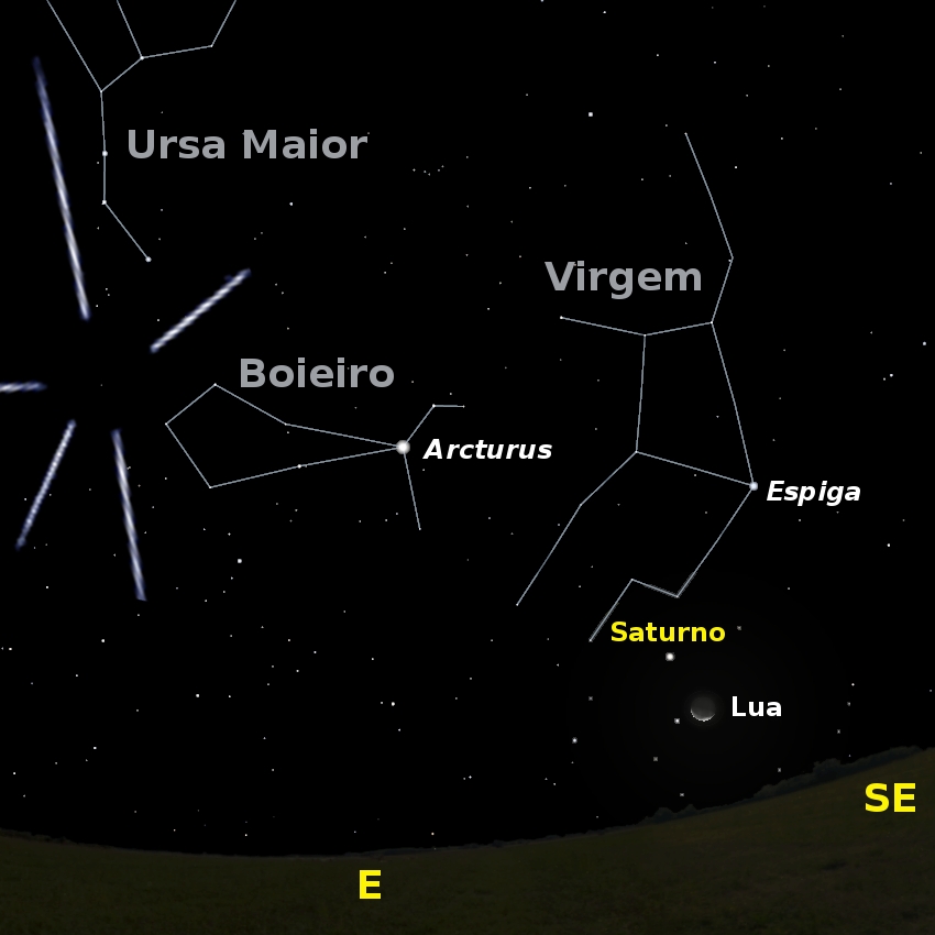 Figura 1: vista do céu a Este pelas 4 horas de dia 7. São visíveis a Lua, Saturno, a estrela Arcturus, o radiante da chuva de meteoros das Quarantidas, a constelação do Boieiro e parte da Ursa Maior.