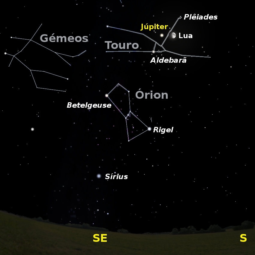 Figura 2: Vista do céu a Sul pelas 20 horas de dia 21. São visíveis Júpiter, a Lua, as constelações de Órion e do Touro, o enxame estelar das Pleiades e algumas das estrelas mais brilhantes desta parte do céu.