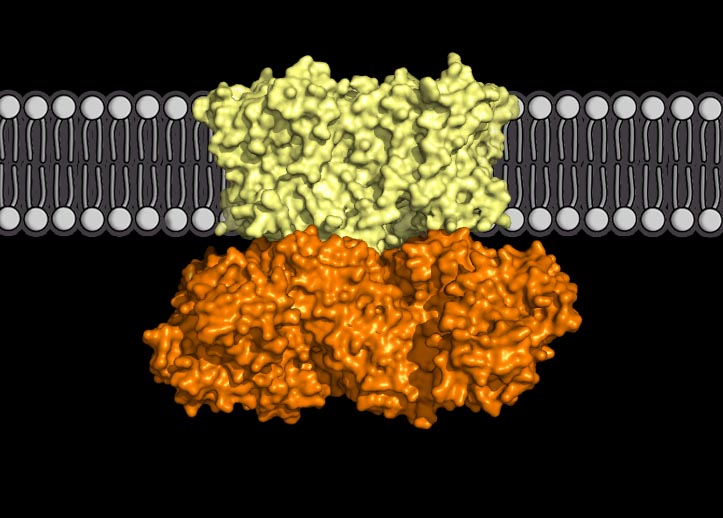 Modelo 3D do transportador KtrAB: a cor mais clara, uma coroa mergulhada na membrana da bactéria e que constitui o poro por onde passam os iões de potássio; e a cor mais escura o anel que ao alterar a forma controla a entrada dos iões.