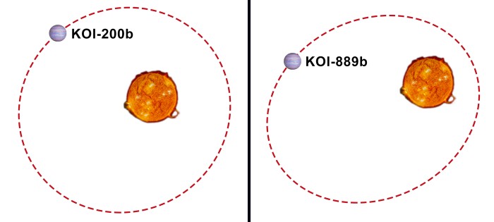 - Já o KOI-889 b é mais denso, com cerca de 10 vezes a massa de Júpiter, concentrada num diâmetro praticamente igual ao do maior planeta do Sistema Solar. Demora quase 9 dias a completar a sua órbita, em volta de uma estrela com 88% do tamanho (e da massa) do Sol.