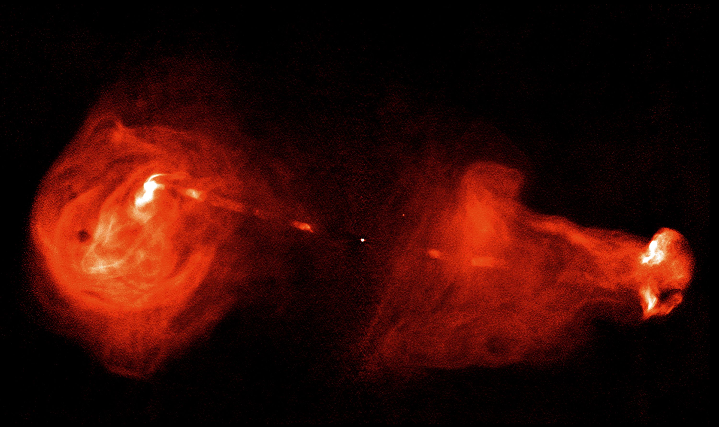 Figura 2: Galáxia 3C353, observada na banda rádio. Os jatos, com uma extensão total superior a 391 mil anos-luz, são emitidos por uma galáxia elíptica, que aparece apenas como o “ponto” brilhante no centro da imagem. Crédito: NRAO/AUI