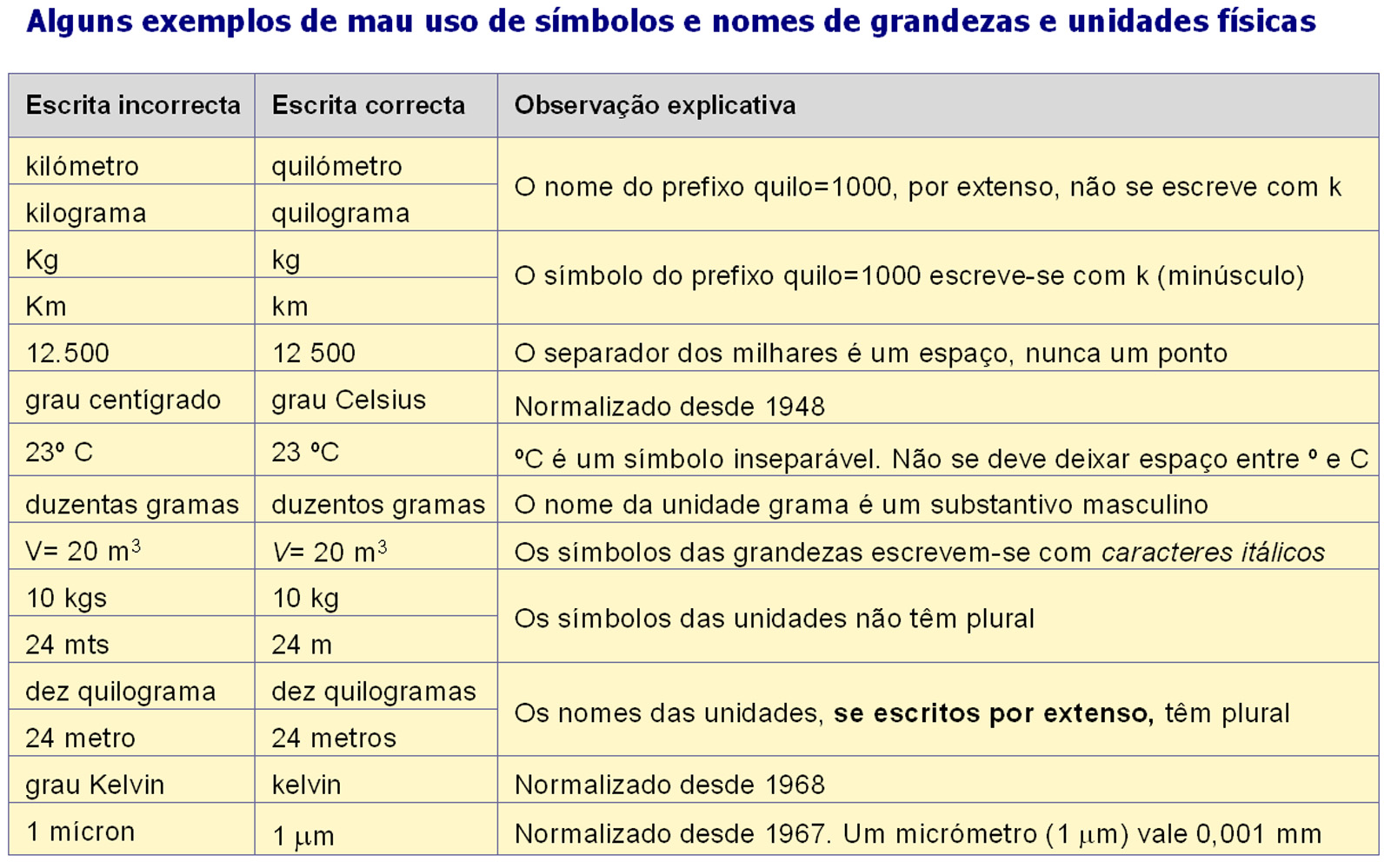 Desde o Decreto-Lei nº 427/83 de 7 de Dezembro, que já tem vários anos, as unidades a utilizar em Portugal deverão ser as do Sistema Internacional de Unidades, abreviadamente representado por SI. E é óbvio que só se deverão utilizar os símbolos correctos. A falta de informação de alguns utilizadores, assim como o tradicional "penso que…" em que se confunde um mero palpite com uma certeza bem documentada, conduzem a incorrecções lamentáveis que urge rectificar. Isto não acontece apenas em domínios especializados: também há inúmeras situações destas na linguagem corrente do dia-a-dia. A tabela anexa mostra vários exemplos.