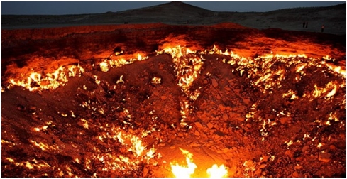 Em Darvaza, no Turquemenistão, existe uma cratera de gás natural que foi criada quando um campo e uma plataforma de perfuração de gás natural aluíram em 1971. Esta cratera, com 70 metros de largura, está situada no meio do deserto de Karakum e é apelidada informalmente pela população local como a Porta do Inferno, uma vez que arde continuamente há 42 anos.