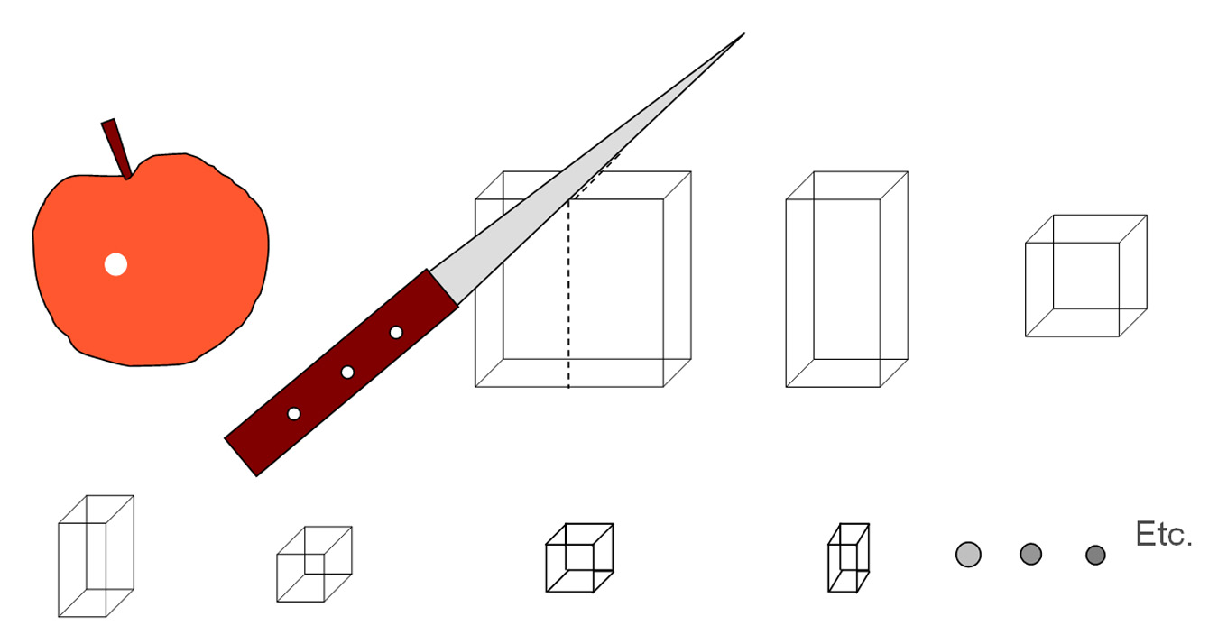 Dizia Demócrito, conceptualmente, que se alguém cortasse uma maçã ao meio com uma faca muito afiada (como a figura mostra), dividindo depois uma das metades ao meio, depois cortando um dos quartos ao meio, e assim sucessivamente, teríamos de parar a certa altura, pois só restaria um átomo, já não divisível (para Demócrito). Não colocaremos a questão de saber da dificuldade técnica de cortar fragmentos minúsculos (ou até da real impossibilidade de o fazer com uma faca, por mais afiada que esta seja), pois não é esse o nosso objectivo. Quantas vezes poderemos cortar a maçã até se chegar a um só átomo? Também parece que precisaremos de a cortar milhares de vezes, ou mesmo milhões, de vezes, para o conseguir. Será assim?