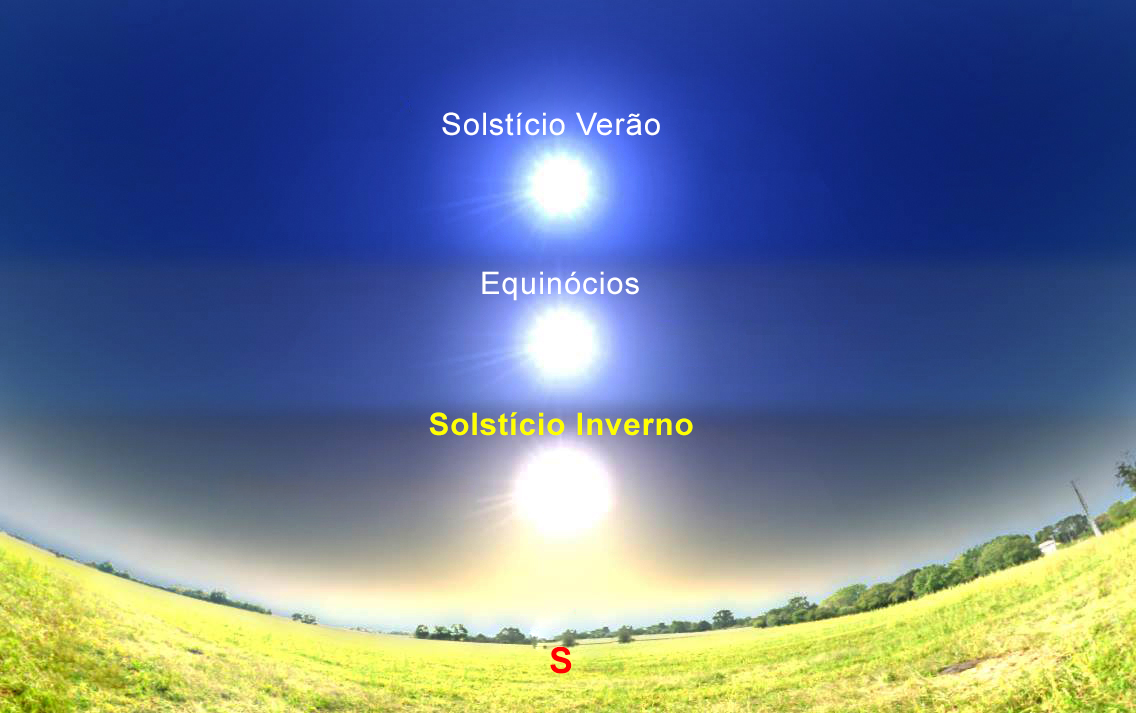 Figura 3: O céu virado a Sul, com indicação da altura do Sol ao meio-dia, nos dias dos solstícios e dos equinócios. (Imagem: Ricardo Cardoso Reis/Stellarium)