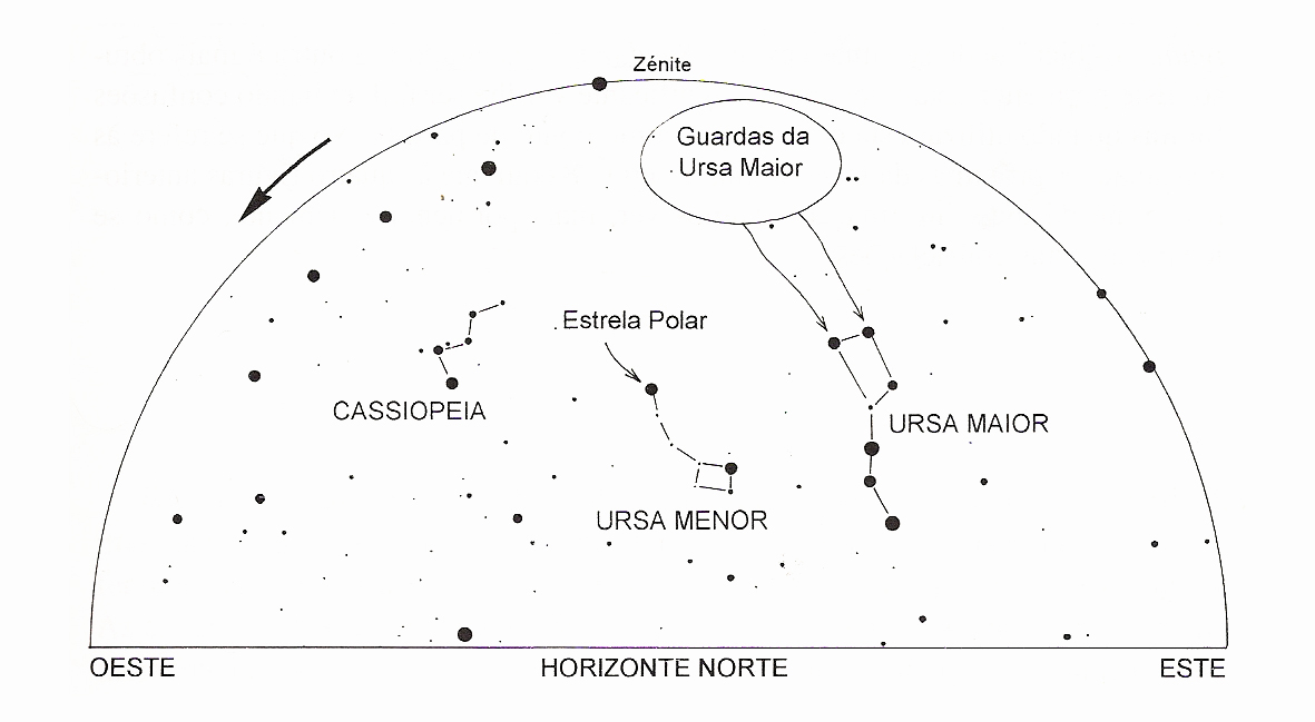 Figura 1 - Aspecto simplificado do céu acima do horizonte norte, numa noite de Inverno. O alinhamento das Guardas da Ursa Maior aponta a posição da estrela Polar. As setas indicam o sentido do movimento aparente do céu.