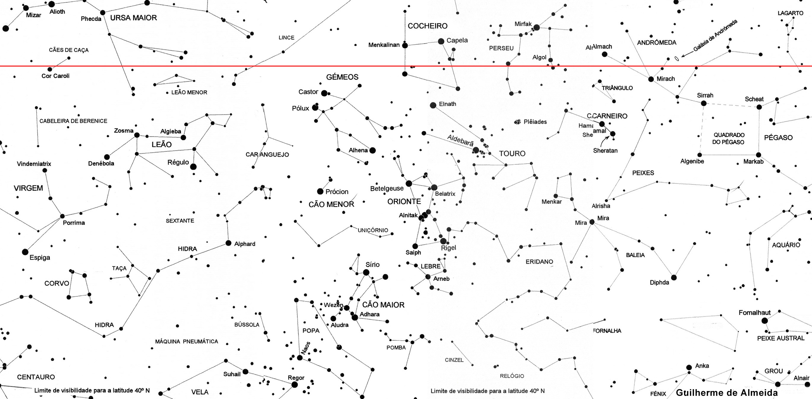 Figura 2 - O céu visível no Inverno, a sul (A MEIO DO COMPRIMENTO DO MAPA). À direita mostram-se as estrelas e constelações que mergulham no horizonte nas primeiras horas da noite, nas primeiras semanas de Inverno. À esquerda vêem-se as que aparecem, do lado nascente, a horas já muito tardias. A linha vermelha marca as estrelas que passam sucessivamente pelo zénite (ponto imaginário do céu, na vertical acima do observador