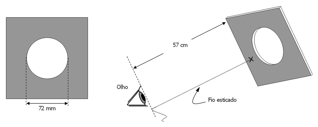 Para delimitar uma pequena parcela do céu, podemos utilizar um quadrado de cartolina preta, com cerca de 24 cm´24cm, recortando nele uma abertura circular com 72 mm de diâmetro, centrada no quadrado (Veja-se a figura). A abertura desenha-se com um compasso e depois recorta-se com uma tesoura. Prende-se um cordel fino a um ponto qualquer da cartolina, de modo que, com a linha esticada e a cartolina perpendicular à nossa linha de visão, a cartolina fique a uns 57 cm do olho. Nada mais simples.