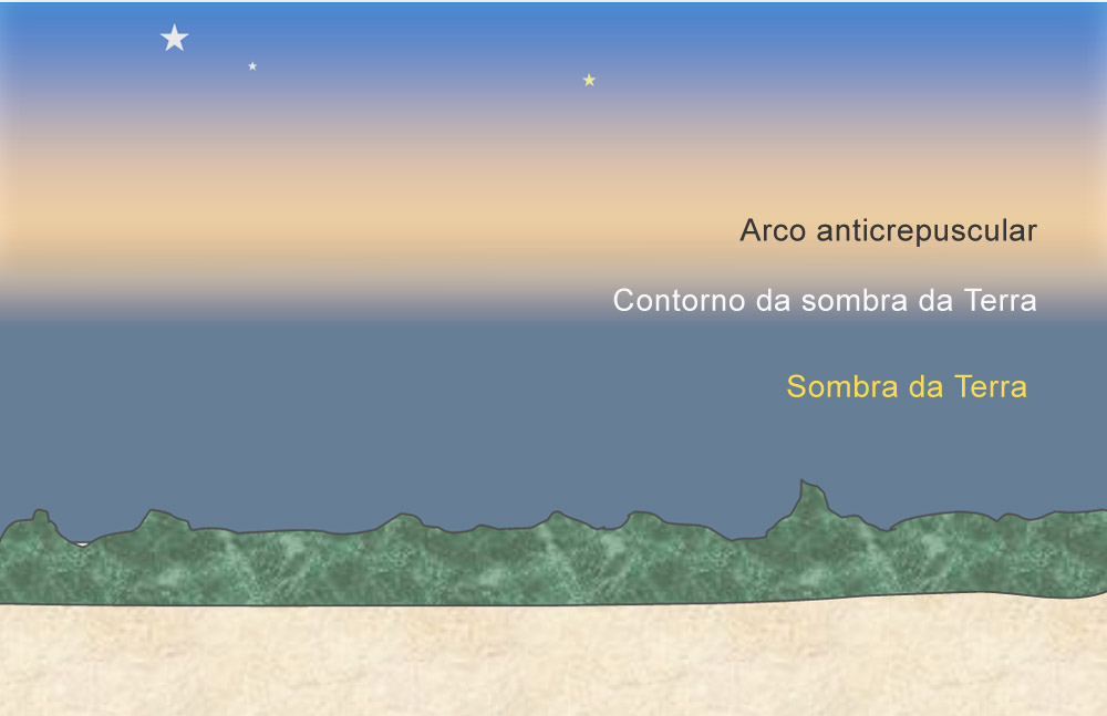 No final da tarde, quase ao cair da noite, podemos ver a sombra da Terra projectada no único alvo suficientemente grande para a conter: a própria atmosfera. Devido às muitas partículas em suspensão, a nossa atmosfera pode funcionar como um enorme ecrã.