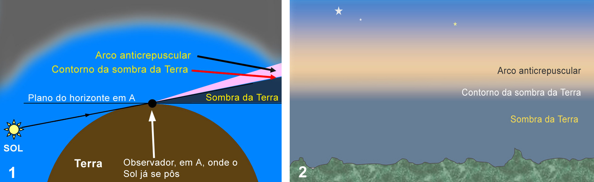 Cerca de meia hora após o pôr-do-sol, quando o céu está limpo, basta olhar acima do ponto Este do horizonte, aproximadamente na direcção oposta àquela onde o Sol se escondeu, para ver a sombra da Terra (Figura 1). De manhã, cerca de meia hora antes do nascer do Sol, também a podemos ver, olhando pouco acima do horizonte Oeste.
