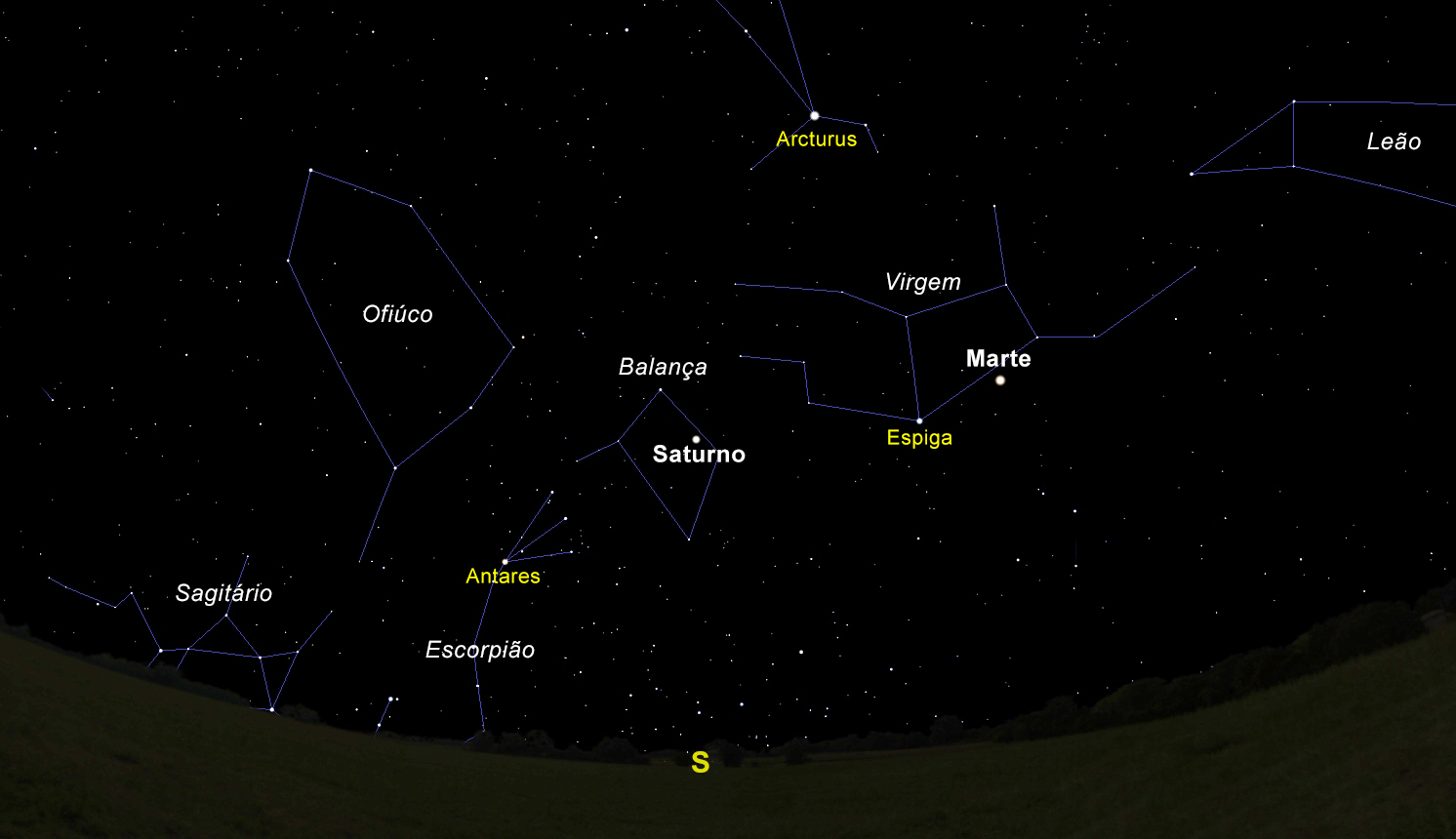 Figura 1: O céu a Sul, no dia 21 de junho, com a estrela Espiga acompanhada de Marte de um lado, e Saturno do outro. (Imagem: Stellarium/Ricardo Cardoso Reis)