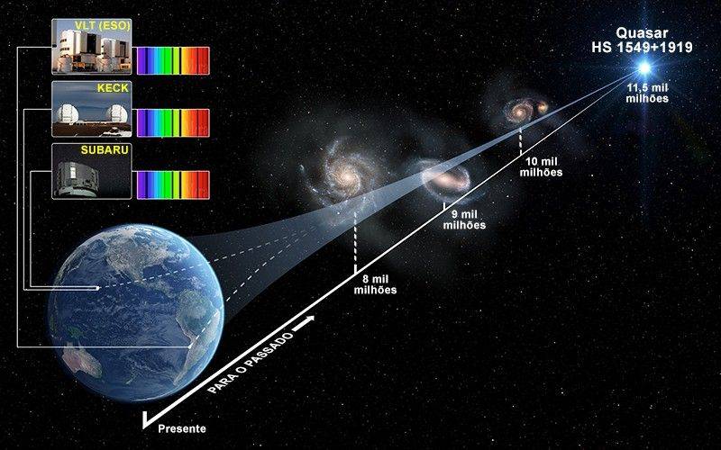 LEGENDA Figura 1: Esquema da medição do espectro do Quasar HS 1549+1919, pelos telescópio do VLT (ESO, Chile), Keck e Subaru (Havai). (Copyright © Swinburne Astronomy Productions)