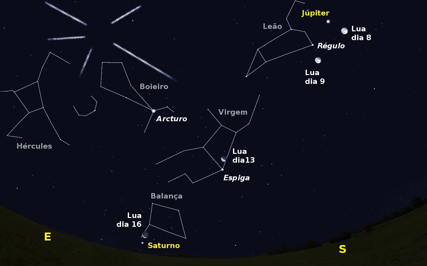 O quarto minguante lunar dar-se-á no dia 13. Por esta altura a Lua estará 3 graus a norte da estrela Espiga da constelação da Virgem.