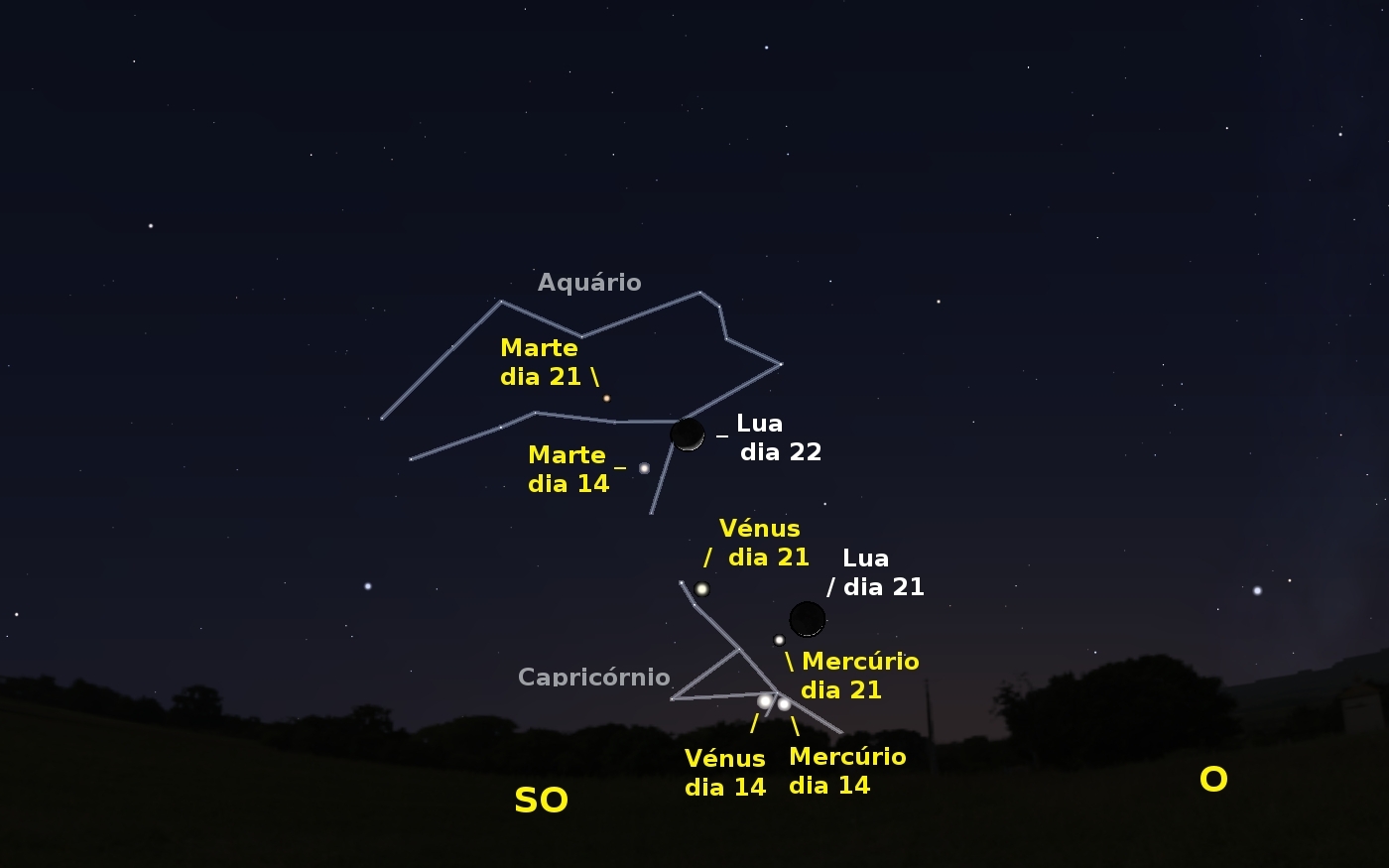 Figura 2: Céu a sudoeste pelas 18 horas e meia de dia 14. Igualmente são visíveis as posições da Lua, Mercúrio, Vénus e Marte no dia 21, e da Lua no dia 22.