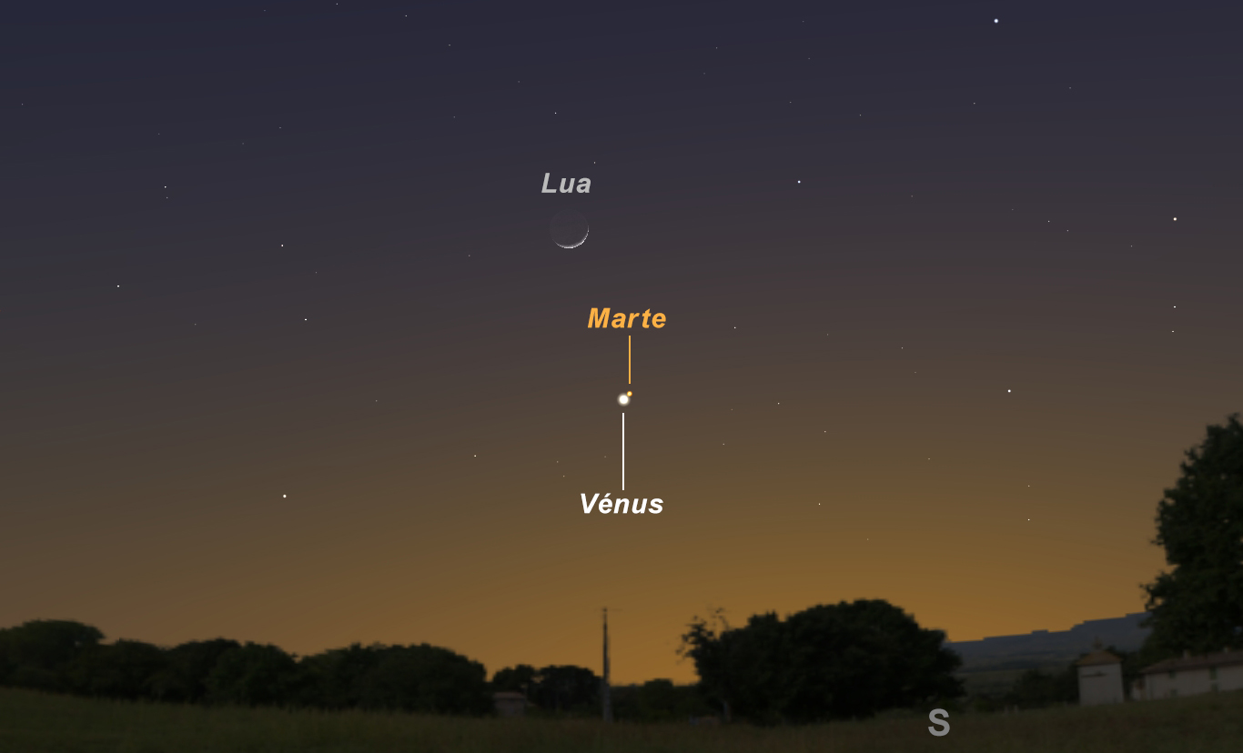 No dia 20, um crescente muito fino da Lua estará separado apenas por 3 graus dos planetas Marte e Vénus. Procurem este trio logo ao anoitecer, pois pôr-se-ão por volta das 20h30. Os dois planetas estarão em conjugação no dia seguinte, passando apenas a meio grau um do outro, no céu. Nesse dia, já a Lua estará a 10 graus de distância de ambos.