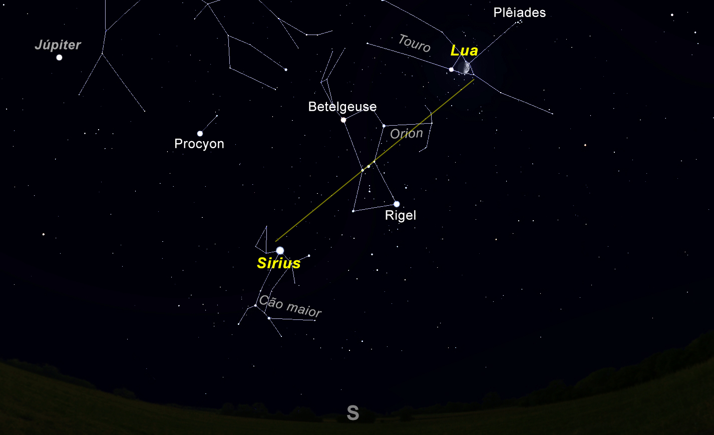 No dia 25, a Lua atinge o quarto crescente. E nessa noite, se traçarem uma linha reta imaginária que passe pelas 3 estrelas do cinto de Orion (conhecidas entre nós como 3 marias), à mesma distância destas, mas em pontas opostas, encontrarão a Lua e Sirius, a estrela mais brilhante do céu à noite.