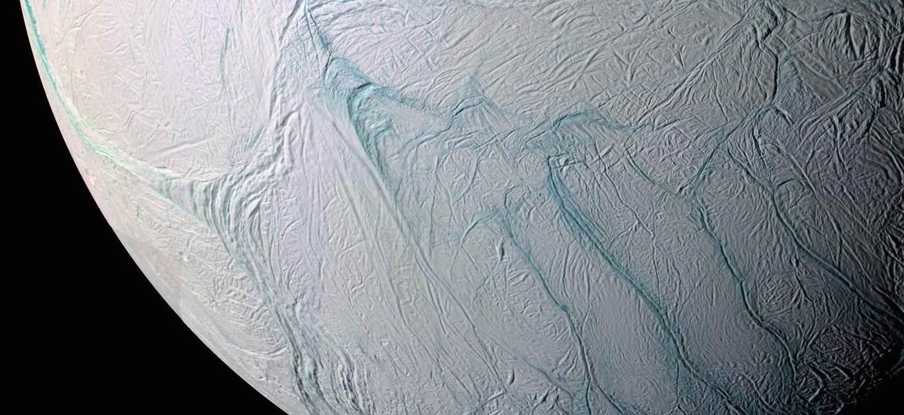 Figura 1 - As “Riscas de Tigre” na superfície de Encélado (filamentos turquesa na superfície branca) são fracturas na superfície onde existem géisers. Estes projectam plumas de vapor de água e outras espécies químicas provenientes de um oceano interior da lua. A cor característica das riscas é devida aos materiais depositados na superfície. Crédito: NASA/JPL.