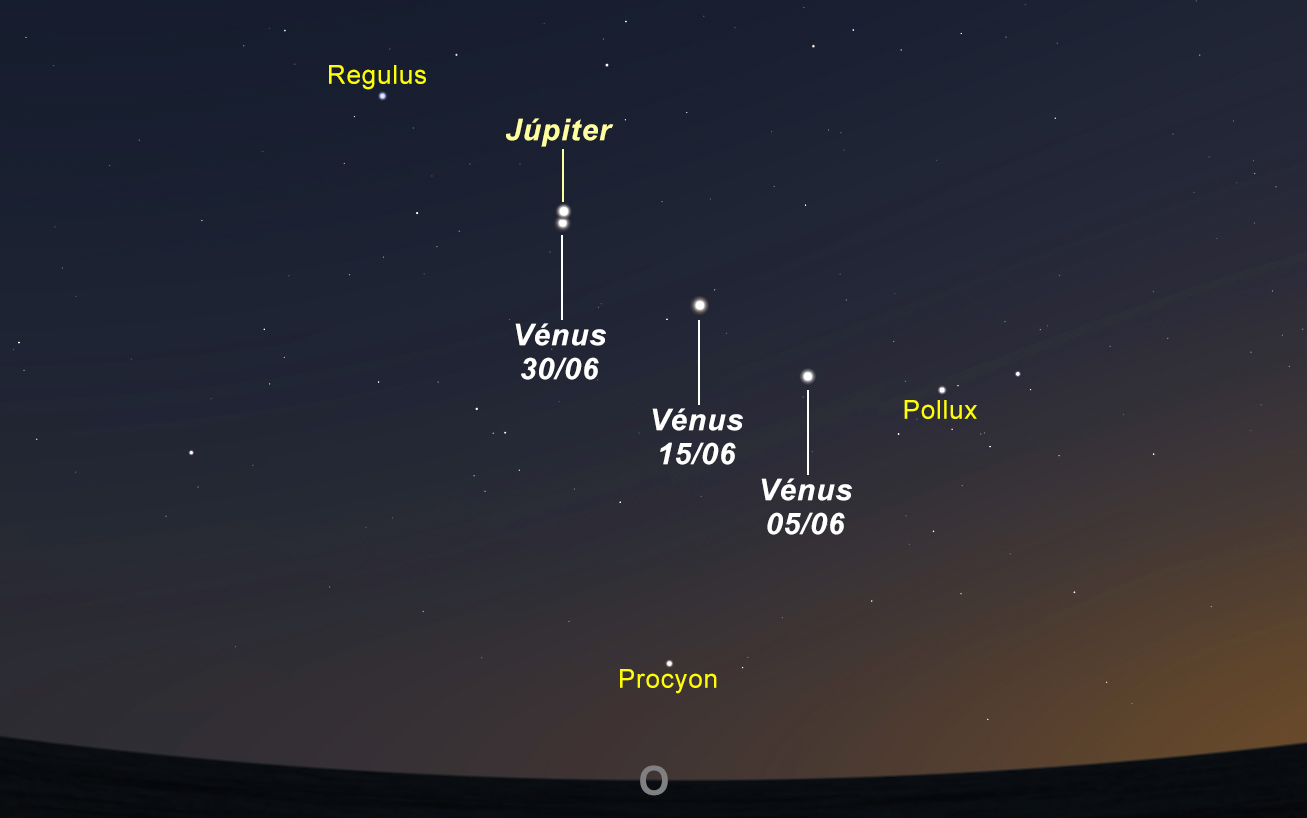 Dos astros do Planetário, para o céu de junho, o grande destaque do mês são os planetas Vénus e Júpiter, respetivamente o segundo e terceiro objetos mais brilhantes do céu à noite (a seguir à Lua). Estas duas “super estrelas”, facilmente identificáveis a Oeste ao pôr-do-Sol, têm-se vindo a aproximar rapidamente. Esta aproximação culminará na conjunção (ponto de maior aproximação) dos dois planetas, no último dia do mês.