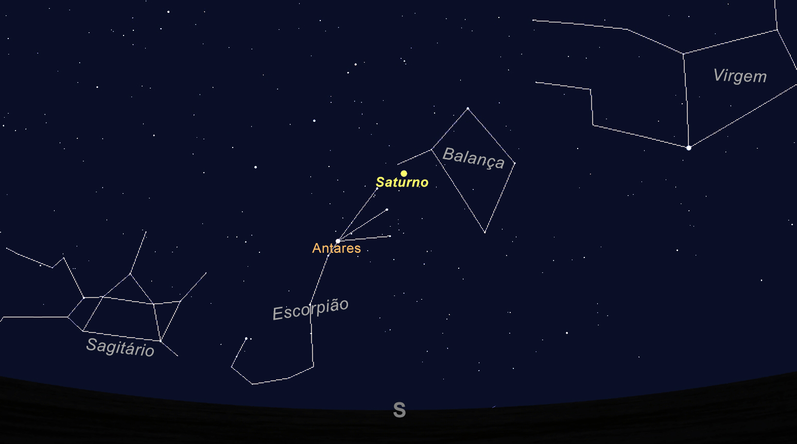 Nessa mesma noite, por volta das 23h30, o planeta Saturno passa a Sul, “seguido” bem de perto pela constelação do Escorpião, onde se destaca a estrela Antares, uma estrela supergigante vermelha quase 900 vezes maior que o Sol.