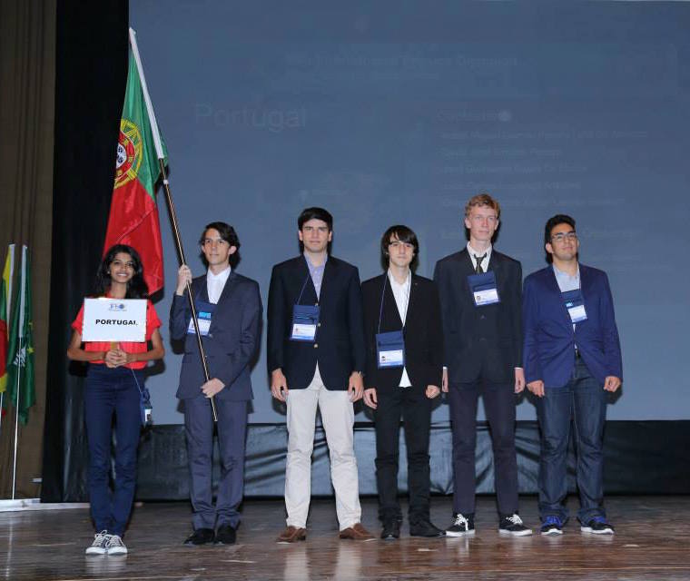 Equipa portuguesa na XLVI Olimpíada Internacional de Física IPhO’2015, que decorreu em Mumbai, Índia, de 5 a 12 de julho de 2015. Da esquerda para a direita: Poorva Daptardar (guia da equipa portuguesa), João Antunes (E.S. da Amadora, menção honrosa), André Almeida (Colégio Luso-Francês, Porto, menção honrosa), David Pereira (E.S. Lima-de-Faria, Cantanhede), Grégory Bonaert (Agrupamento de Escolas Júlio Dantas, Lagos, medalha de bronze) e José Matos (E.S. de Mirandela, menção honrosa).