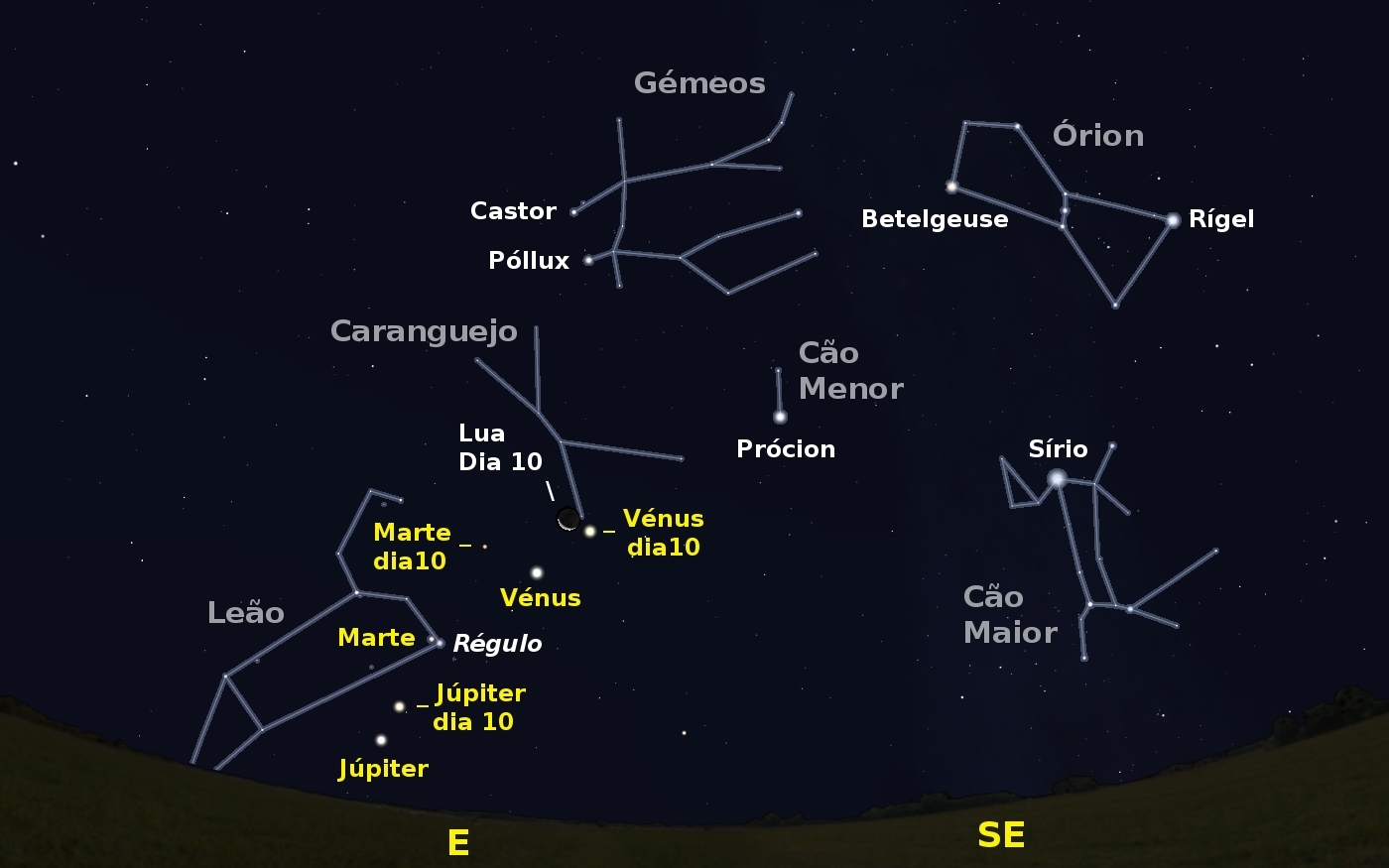 Pelas 5 horas da madrugada de dia 10 será possível ver a Lua na vizinhança de Vénus e Marte. Igualmente Júpiter ocupa esta parte do céu, nascendo pelas 6 horas e 20 minutos. Este planeta só começará a ser bem visível na segunda metade do mês.