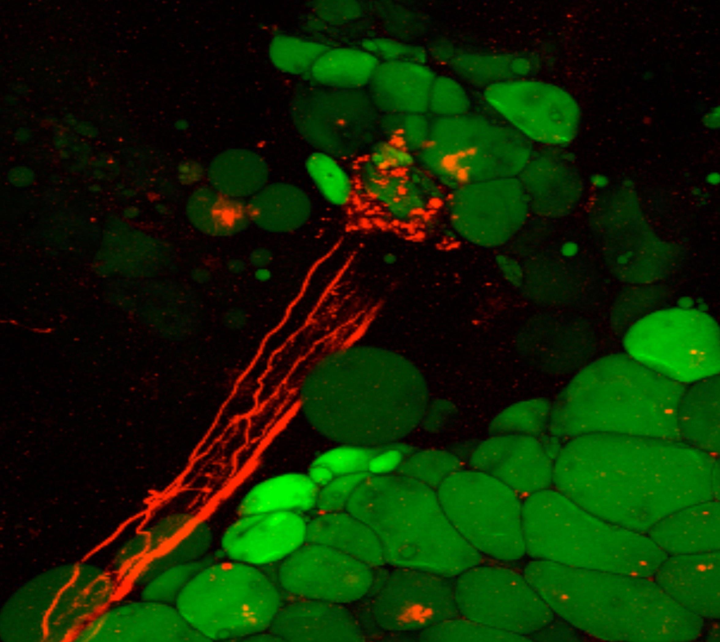Usando diferentes abordagens e técnicas, a equipa de investigação liderada por Ana Domingos conseguiu estabelecer, pela primeira vez, que o tecido adiposo é inervado. "Nós dissecámos estas fibras nervosas do tecido gordo de ratinhos e usando marcadores moleculares identificámos um tipo de neurónios, os neurónios simpáticos", explica Ana Domingos. Mas mais do que isso, "quando utilizámos uma técnica de imagem ultra sensível no tecido adiposo vivo de um ratinho, observámos que as células de gordura são encapsuladas por estes terminais nervosos simpáticos".