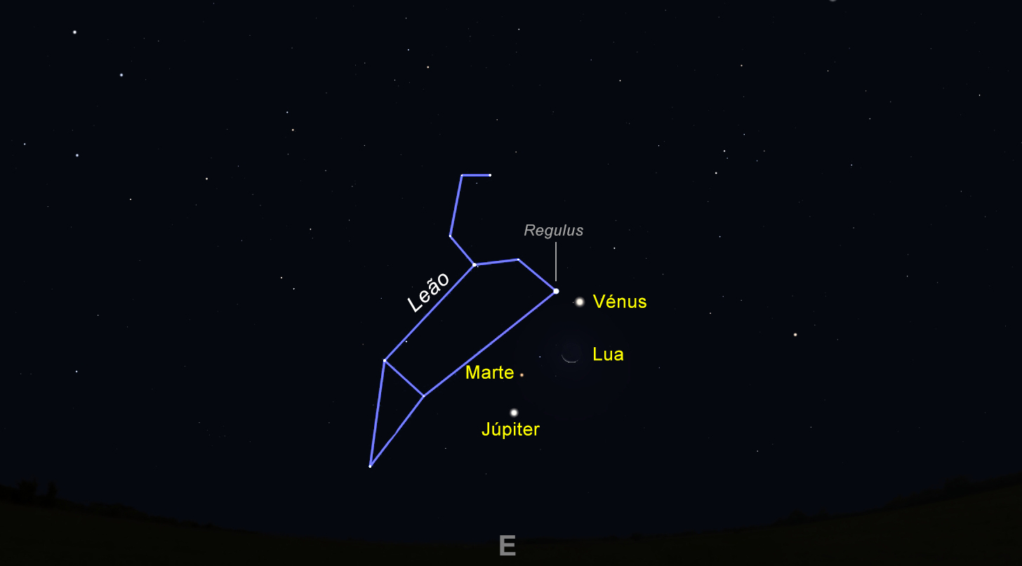 No amanhecer do dia seguinte serão quatro os objetos do Sistema Solar “empacotados” na constelação de Leão. Júpiter, Marte, a Lua e Vénus estarão dispostos quase em linha reta, com os dois das pontas (Júpiter e Vénus) separados por pouco mais de 12 graus (aproximadamente um punho fechado, à distância de um braço esticado).